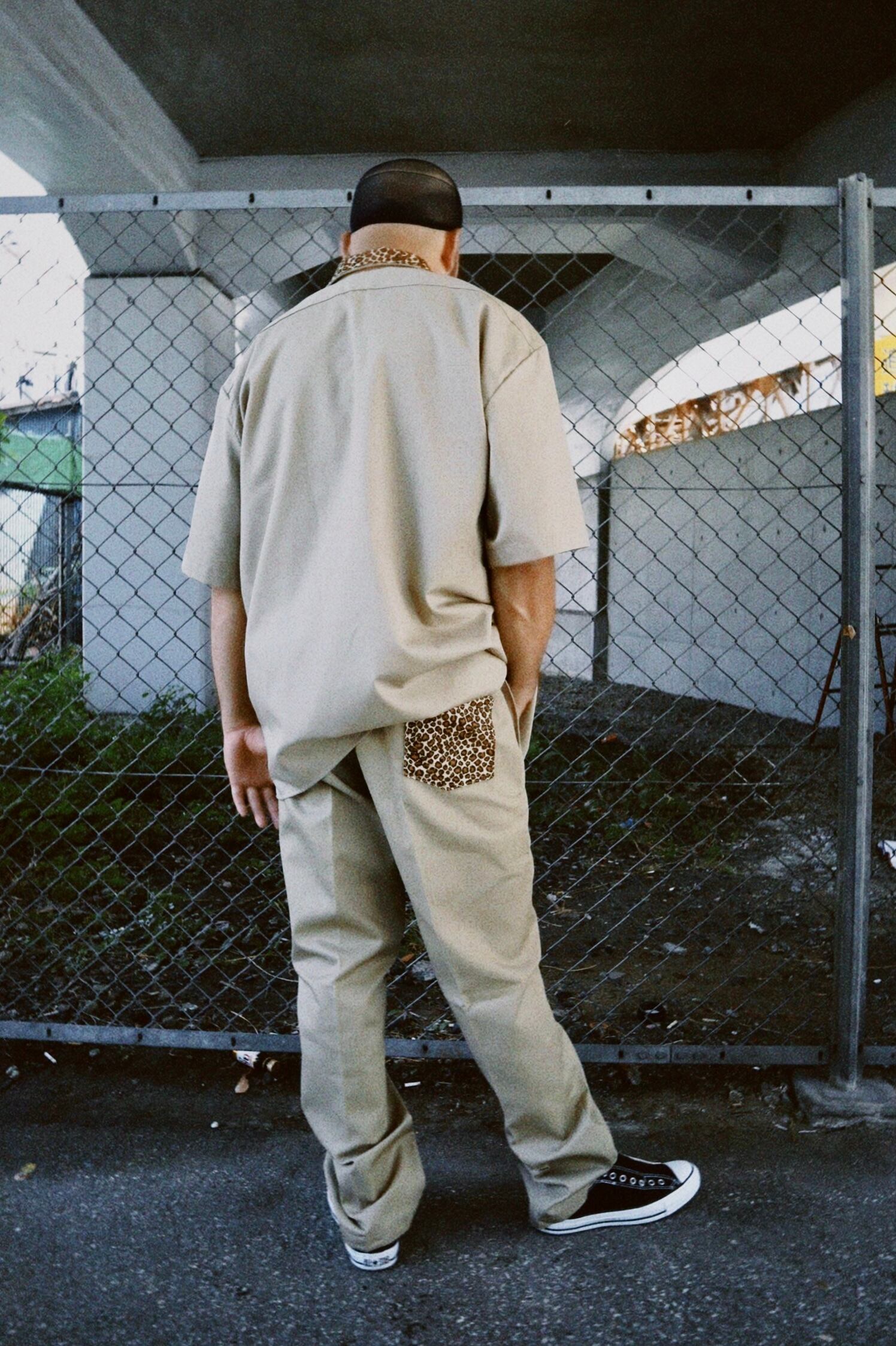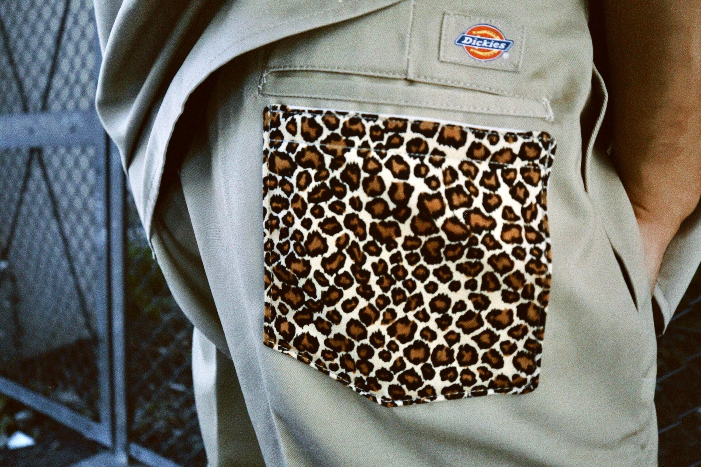 ディッキーズUS規格のシャツ1574 & ボトムス874を採用。雨避け(スコッチガード)付きでしっかりとした8.5オンスのTCツイル生地は、タフで汚れずらく、綺麗なシルエットを保ちます。シャツ左胸、ボトムス左足にシルクスクリーンプリント。上襟、後ろポケットにレオパード生地を上から縫製しました。