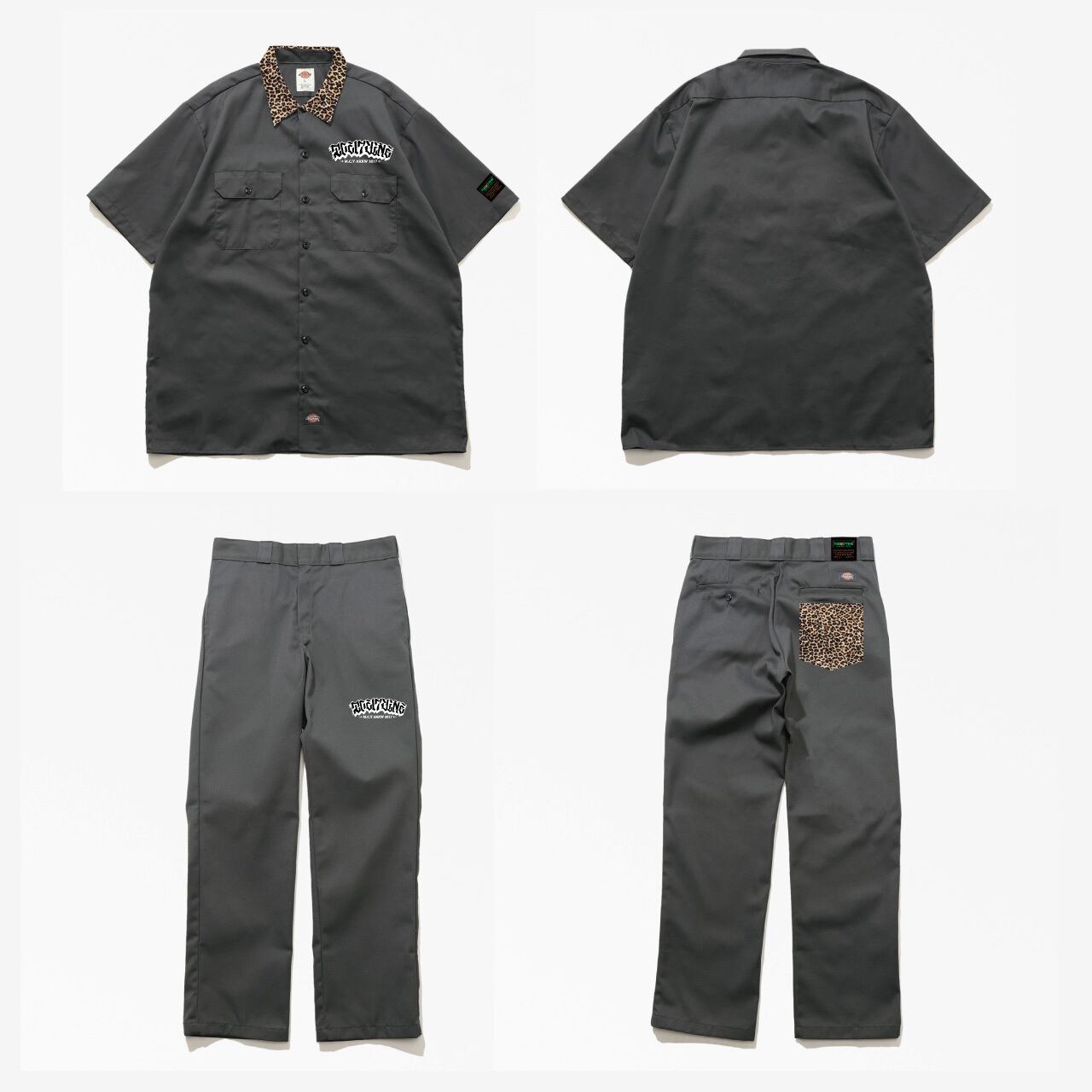 ディッキーズUS規格のシャツ1574 & ボトムス874を採用。雨避け(スコッチガード)付きでしっかりとした8.5オンスのTCツイル生地は、タフで汚れずらく、綺麗なシルエットを保ちます。シャツ左胸、ボトムス左足にシルクスクリーンプリント。上襟、後ろポケットにレオパード生地を上から縫製しました。
